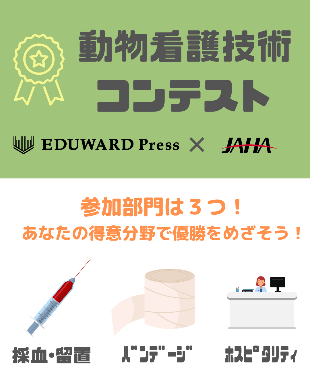 ※このコンテストは、動物看護専門月刊誌「動物看護」の出版社である株式会社EDUWARD Press とコラボ企画です。現在、株式会社EDUWARD PressとJAHAの共催で『動物看護トレーニングセンター』を開講しております。愛玩動物看護師の皆さんの“動物看護技術”を磨く実践型セミナーを実施しております。