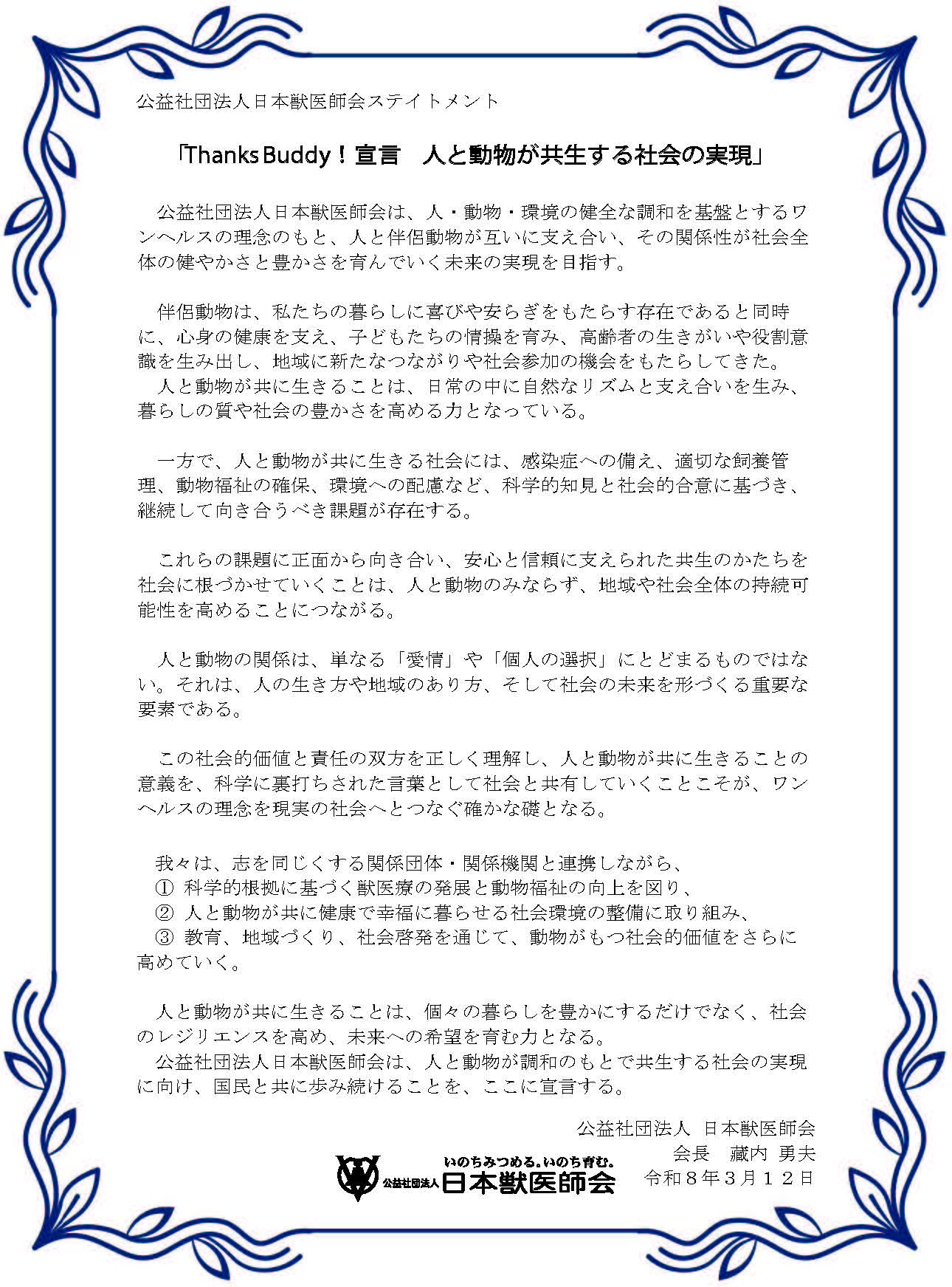公益社団法人日本獣医師会では、動物との共生がもたらす価値を社会に広く発信するため、ステイトメント「Thanks Buddy ! 宣言 人と動物が共生する社会の実現」を公表するとともに、これを実践する取り組み「Thanks Buddy Project」へご賛同いただける動物病院の皆さまを「賛同動物病院」として広く募集中です。